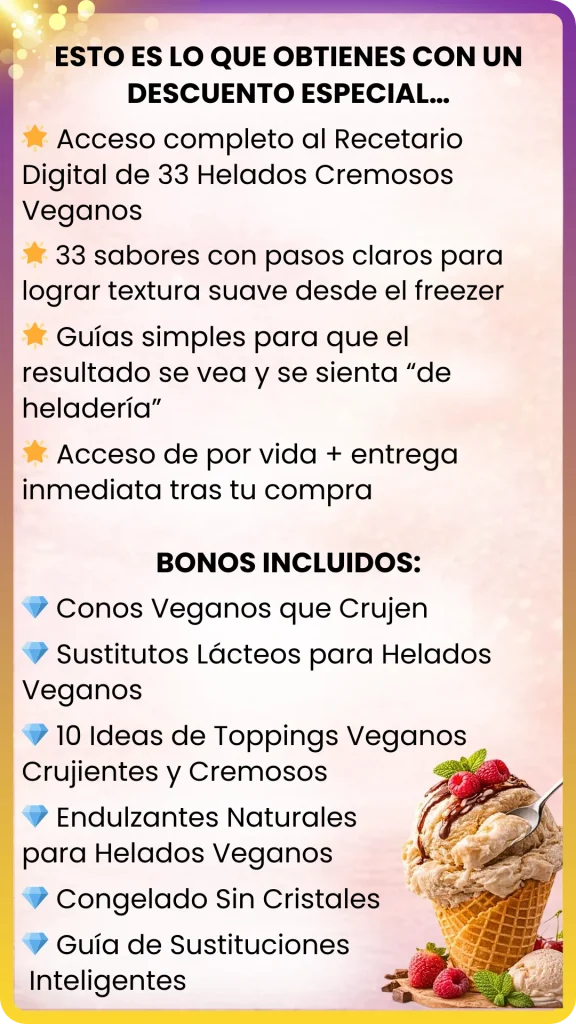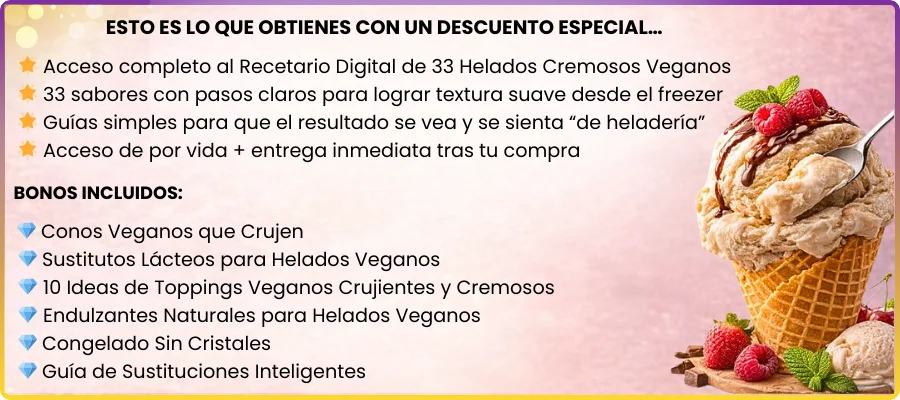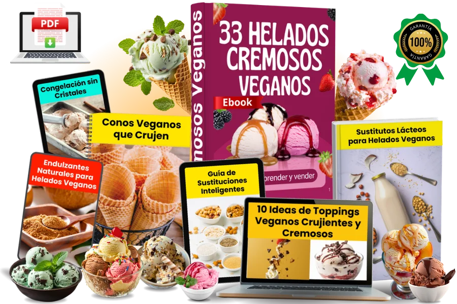 ✅ Ebook principal: “Recetas de 33 Helados Cremosos Veganos y con una variedad de Sabores Irresistibles”